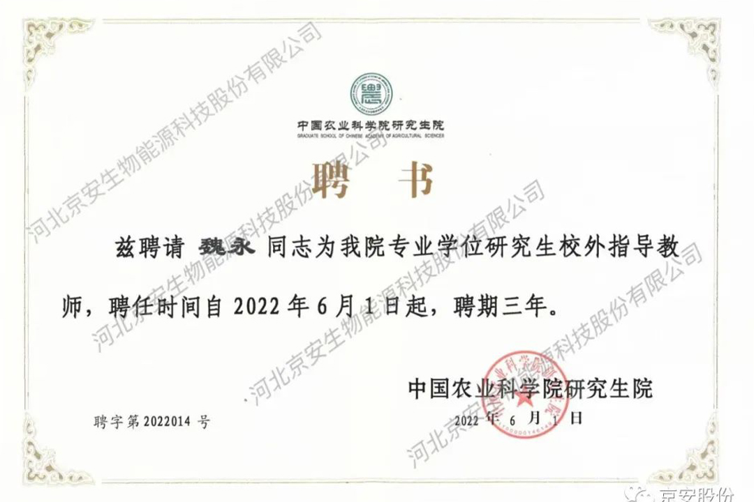 魏永同志被聘为中国农业科学院研究生院校外导师!近日,中国农业科学院研究生院聘请京安股份公司董事长兼总裁魏永同志为该校专业学位研究生校外指导教师,聘期三年。